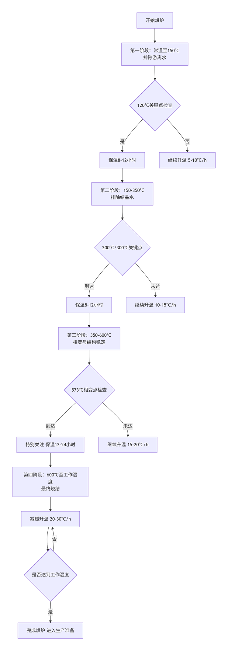 典型的烘爐過程可分為四個(gè)關(guān)鍵階段,每個(gè)階段都有其特定的物理化學(xué)變化和控制要點(diǎn):階段一:常溫至150℃——游離水排除期